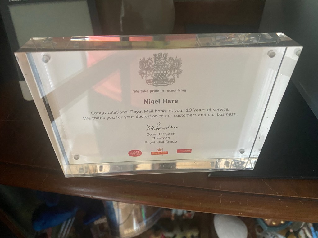 Today we applauded a worker on ten years with the company. When I reached ten years, I got a plaque. (Picture left) The worker today got a card and a QR code that, when scanned, showed him a vid meme with balloons saying well done for ten years. That is the value the company now places in its base workers.